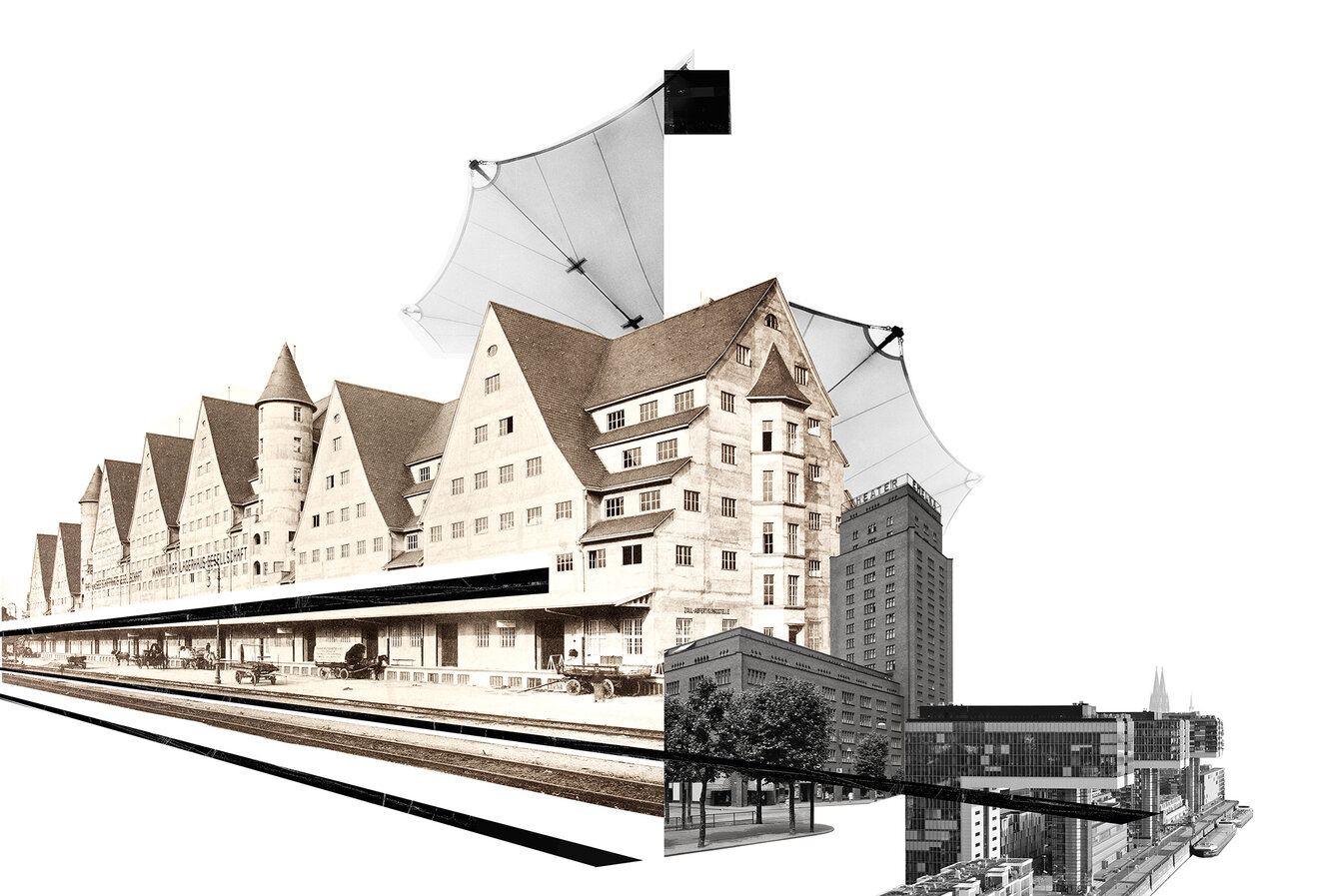 Gar nicht abweisend ist der Rheinauhafen. Obwohl er durchaus als steril empfunden werden kann – »Architekturzoo« wird er auch gelegentlich genannt. Das zwischen 2002 und 2014 von verschiedenen Architekten umgebaute Areal ist eines dieser Projekte zur Standortaufwertung mit hochklassiger Architektur und hochpreisigen Immobilien. Markantestes Zeichen sind die drei Kranhäuser von Bothe Richter Teherani und Alfons Linster. Man mag darin eine zeitgenössische Adaption von El Lissitzkys Wolkenbügel-Hochhäusern von 1925 sehen, auf jeden Fall bilden sie in der Form eines umgedrehten »L« ein einzigartiges Wahrzeichen an der Uferlinie. In dem Mix aus umgenutzten Bestandsimmobilien und Neubauten im Rheinauhafen finden sich zahlreiche interessante Details, wie die rheinseitigen puzzleartigen Balkone der »wohnwer[f]t« oder das »Siebengebirge« als erster Stahlbetonbau Deutschlands – und in dem fast zwei Kilometer langen Areal braucht es viel Zeit, all diese Details zu entdecken. Es ist nicht alles überragend im Rheinauhafen, insbesondere beim Blick auf die Grundrisse offenbart sich, dass die Nutzbarkeit schon mal zugunsten der Optik vernachlässigt wurde. Aber es ist genau diese architektonische und städtebauliche Strin genz, die man sonst so oft vermisst.