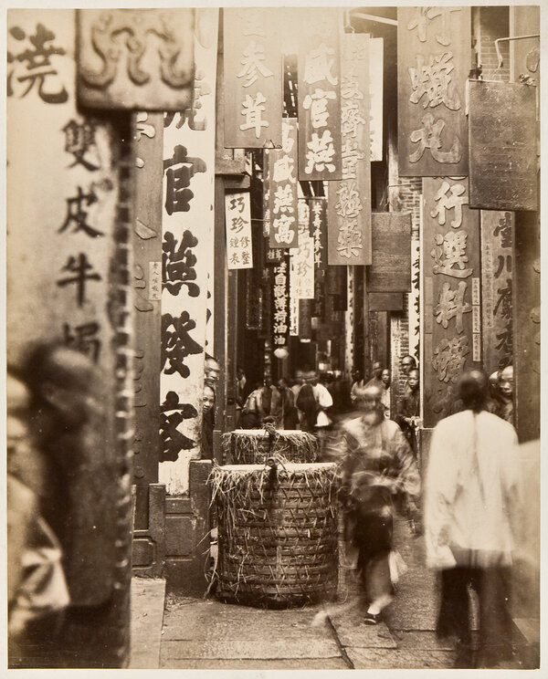 Museum für Ostasiatische Kunst KölnSchon im 19. Jahrhundert zählt Kanton (Guangzhou) im Süden Chinas mit etwa einer Million Einwohner*innen zu den größten Städten des Landes. Im einzigen Hafen des Kaiserreichs, der auch ausländischen Händlern offensteht, werden in Europa so begehrte Waren gehandelt wie Tee, Gewürze, Porzellan, exotische Pflanzen und Seide. Umgekehrt zeigt China allerdings wenig Interesse an europäischen Produkten. Der Versuch der Briten, indisches Opium anstelle des teuren Silbers als Tauschmittel einzuführen, gipfelt in den sogenannten Opiumkriegen. Im Kampf gegen das Rauschgift und die Engländer muss das Reich der Mitte die Waffen strecken. In den 1860er-Jahren, als die Aufnahme entsteht, ist Kanton wie Hongkong bereits Außenposten des britischen Empires. Der Handel floriert – die Großstadt pulsiert. Da kann es in den – im Vergleich zu denen in Europa – extrem schmalen Geschäftsstraßen mit Läden dicht an dicht schon mal eng werden. Der schottische Fotograf John Thomson schreibt 1873 in sein Reisetagebuch: »Die Läden in guten Straßen sind von fast einheitlicher Größe; (…) in jedem gibt es eine Wohnung, die zur Straße geht, und eine Theke aus Granit oder Ziegelstein, um die Waren auszulegen. Auf einem Granitsockel steht auch das senkrechte Aushängeschild. (…) Man kann Aushängeschilder als gute Beispiele für die Straßenliteratur Chinas betrachten, die die nationale Neigung der Geschäftsinhaber zeigen, noch ihre einfachsten Waren mit einer hochgestochenen klassischen Wendung anzupreisen, die, soweit ich sehen kann, in keinerlei Beziehung zum Inhalt des Ladens stehen.« Tatsächlich laden die Reklametafeln der chinesischen Einkaufsmeilen zum Lesen ein – die Texte, Namen und Werbeslogans spielen auf berühmte literarische Vorbilder und Ideen an. Sie versprechen den »ewigen Frühling«, »doppeltes Glück«, »große Harmonie« und preisen Produkte wie das »Elixier der Unsterblichkeit« an. Das wirkt aus westlicher Perspektive manchmal naiv und unfreiwillig komisch, aber – seit wann gehört die Übertreibung nicht auch bei uns zum gängigen Stilmittel?