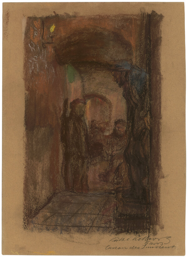 Bei Reisenden aus Fernost wird es zunehmend beobachtet: das »Paris-Syndrom«. Japanische Tourist*innen verzweifeln und leiden, wenn die Seine-Metropole, verehrt als Stadt der Liebe, Kunst und Eleganz, so gar nicht ihren lang gehegten Erwartungen entspricht. Ruppig statt romantisch, Müll statt Monet. Käthe Kollwitz (1867 – 1945) konnte das nicht schrecken. Als die Künstlerin im Jahre 1904 zwei Monate lang in Paris weilt, ist sie »bezaubert«. Paris ist zu jener Zeit der Inbegriff der modernen Stadt, mit breiten Boulevards, sternförmigen Plätzen und großbürgerlichen Gebäuden. Tagsüber besucht Kollwitz Cafés, Museen, Ateliers und vor allem die Plastik-Klasse der Akadémie Julien. Nachts findet man sie in den Tanzlokalen auf dem Montmartre und dem Montparnasse, aber auch in den zwielichtig-düsteren Kellerkneipen unter den Markthallen. Der Schriftsteller und Kunstkritiker Wilhelm Uhde (in die Spelunken kommt die Dame nur in Herrenbegleitung) erinnert sich: »[Im] Caveau des Innocents saßen die jungen Mörder, Kinder, trunken von Liebe und Eifersucht, während draußen Türen schlugen, in der Finsternis Schreie wie von Sterbenden tönten.« Die Atmosphäre der Halbwelt inspiriert Käthe Kollwitz zu einer Reihe von Zeichnungen, die heute zu ihren modernsten Werken gehören.