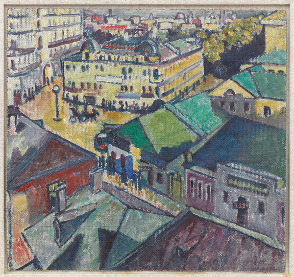 Viel passiert im Leben des Wassily Kandinsky (1866 – 1944). Hat der russische Grafiker und Künstler doch gerade gemeinsam mit Franz Marc in Deutschland Furore gemacht. »Der Blaue Reiter« nennt sich ihre Bewegung, und Kandinskys Malerei – erst noch nah an der Natur – wird deutlich abstrakter. Farben und Formen sollen sich vom Gegenstand befreien. Mit Gabriele Münter, seiner ehemaligen Schülerin und Lebenspartnerin, bereist er die Metropolen Europas und Tunis, lehrt, malt, organisiert Ausstellungen und entwirft 1912 für die Kölner Parfümfabrik Farina, die älteste heute noch bestehende Duftmanufaktur der Welt, einen Flakon, der schon zehn Jahre vor Gründung des Bauhauses dessen Formen vorwegnimmt. Kandinskys Lebensplan gerät jedoch aus den Fugen – angesichts der Kriegserklärung Deutschlands an Russland am 1. August 1914 flüchtet er in die Schweiz und schließlich nach Moskau. In seinem eigenen Mietshaus mit Blick auf den Zubowski-Platz bezieht er eine großzügige Wohnung im Dachgeschoss, wo auch die russische Avantgarde – darunter die Künstler Kasimir Malewitsch und Alexander Rodtschenko – ein- und ausgeht. Erst langsam besinnt er sich wieder auf die Malerei und auf das, was er sieht. Kandinsky schreibt der nach Stockholm emigrierten Münter, von der er sich wenig später trennt: »Ich arbeite viel. Ich mache die ganze Zeit Landschaften von meinen Fenstern aus: bei Sonne, in der Nacht, bei bedecktem Himmel. Ich finde das unterhaltsam und (…) studiere die verschiedenen Farbharmonien. Und wann immer ich denke, ich sollte vielleicht aus dem Haus gehen, fühle ich mich richtig schlecht.« Nicht ganz unbegründet, denn da draußen braut sich einiges zusammen: 1917 wird Kandinsky während der Oktoberrevolution enteignet, um sein nicht unbeträchtliches Vermögen wie auch um seine Immobilie am Zubowski-Platz gebracht.