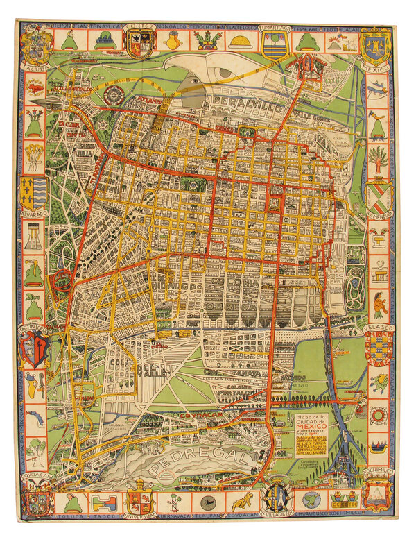 Rautenstrauch-Joest-MuseumDie Einheimischen nennen sie »El Monstruo« – das Monster. Mexiko-Stadt gilt als dreckig, gnadenlos überfüllt und – in den letzten Jahren erst recht – als brandgefährlich. Horrorgeschichten vom tobenden Drogenkrieg in der Millionen-Metropole taugen nicht zur Imagepolitur. Der historische Stadtplan lässt diese Dimensionen noch nicht erahnen: 1932 veröffentlicht, sollte er die neuen elektrischen Straßenbahnen bewerben, die im selben Jahr den letzten Maultier-Zug ablösten. Der Plan präsentiert Mexiko-Stadt als moderne, aber traditionsbewusste Großstadt, die ihre indigenen vorspanischen Wurzeln pflegt. Gezeichnet hat ihn Emily Edwards, einst eng verbunden mit der mexikanischen Kunstelite um Diego Rivera und Frida Kahlo.