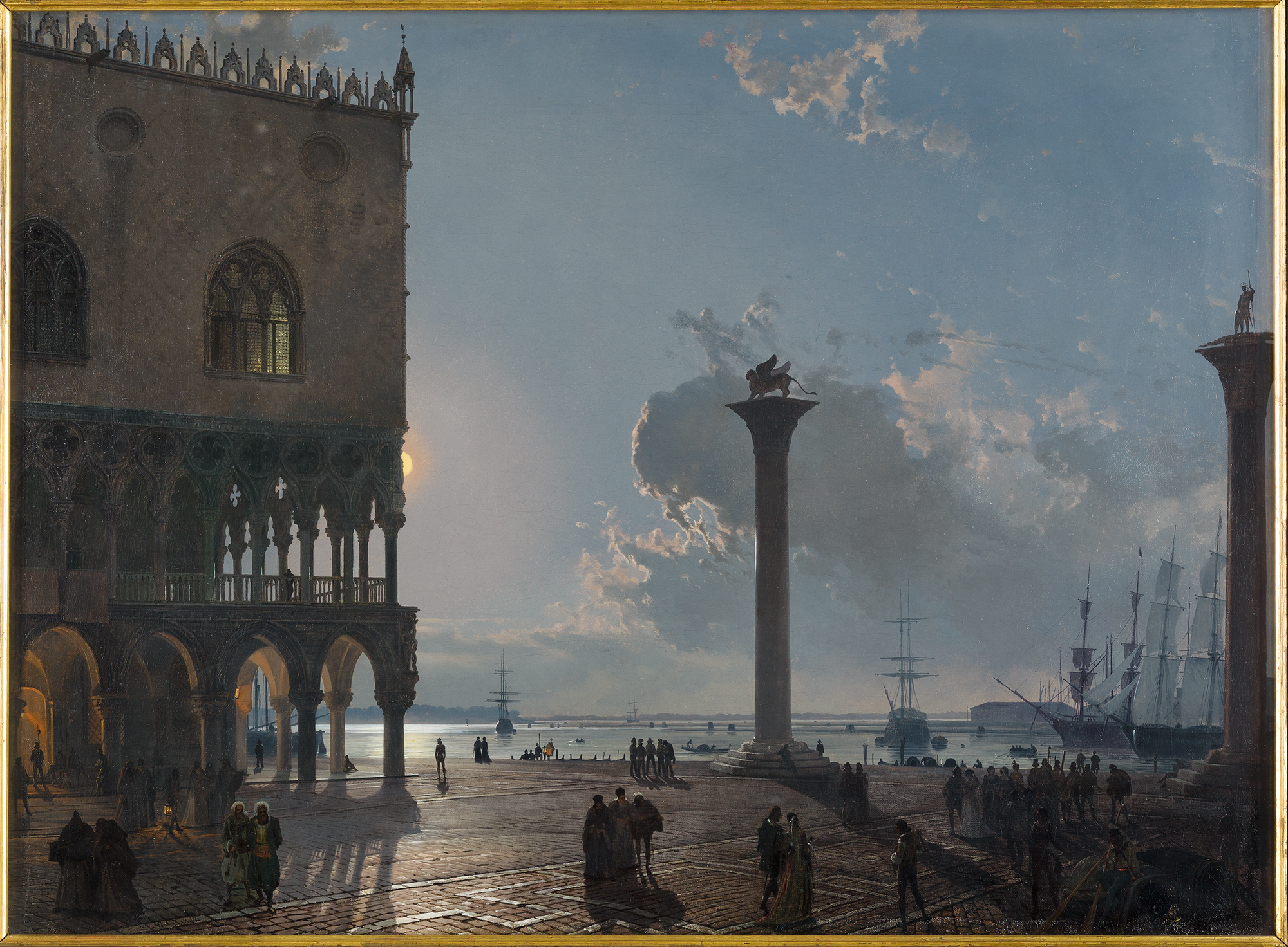 Der »Porträtist Venedigs« lebt gut davon. Zur Freude der in Scharen in die Stadt einfallenden Bildungstourist*innen zählen zu dessen liebsten Motiven die bekannten Sehenswürdigkeiten: Dogenpalast und Piazzetta, Piazza San Marco samt Markuskirche und der Canal Grande mit den prunkvollen Palazzi. Die romantische Ansicht der nächtlichen Piazzetta aus der Sammlung des Wallraf bringt Nerly insgesamt 36 mal auf die Leinwand. Und wie man heute weiß, malt er sie tagsüber, also im Sonnen- statt im Mondenschein. Die bis heute ungebrochene Zuneigung der Reisenden ist für die Einheimischen Segen und Fluch zugleich – etwa 50 000 wohnen in der Stadt, die jährlich an die 30 Millionen Reisende besuchen. So hat La Serenissima mit vielen Problemen zu kämpfen – den Menschenmassen, dem Absacken ihrer Gebäude, dem Verfall der Kulturschätze, steigenden Pegelständen und Jahrhundert-Hochwassern als Folge des Klimawandels. Und um zumindest nicht vollends zum Vergnügungspark à la Disneyland zu verkommen, greift die Verwaltung inzwischen zu rabiateren Mitteln: Eintrittsgelder für Tagestouristen, Strafen für Fehlverhalten wie für das Bad in den Kanälen und für eine allzu legere Kleiderordnung der durchs Gedränge Flanierenden.